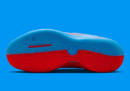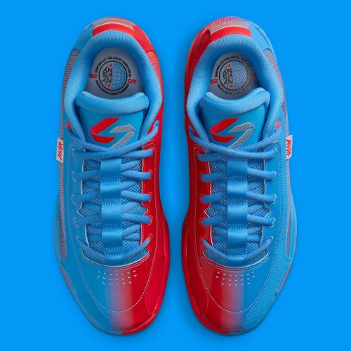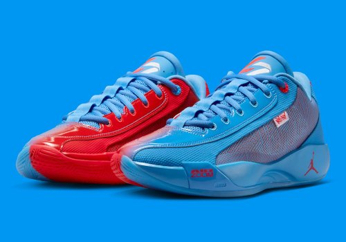 We’re reminded, of course, of “Bomb Pop” popsicles (or “Rocket Pops/Firecrackers” depending on where you grew up). That cherry, lime, and blue raspberry combo hits different when you’ve been out and about enjoying summer, and it plays on this Luka .77 all the same. Split color blocking is the obvious design choice here, with the lateral side appearing in blue and medial side appearing in bright red. Save for an all-blue tongue, the playful clashing of colors is seen throughout the entire shoe, including the outsole and patent leather on toe box/heel. A white tag featuring graffiti-inspired “NY vs NY” text juts out around the lateral quarter, complemented by custom tournament graphics on the insoles. The Luka .77 is designed for outdoor surfaces, which makes its inclusion in Jordan/Nike’s “NY vs NY” lineup more than natural.