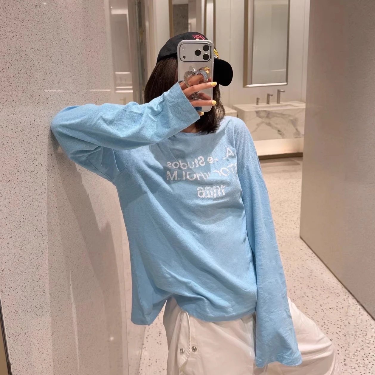 Ac~新款字母印花烫钻长袖T水洗蓝圆领宽松长袖T恤早春系列设计感