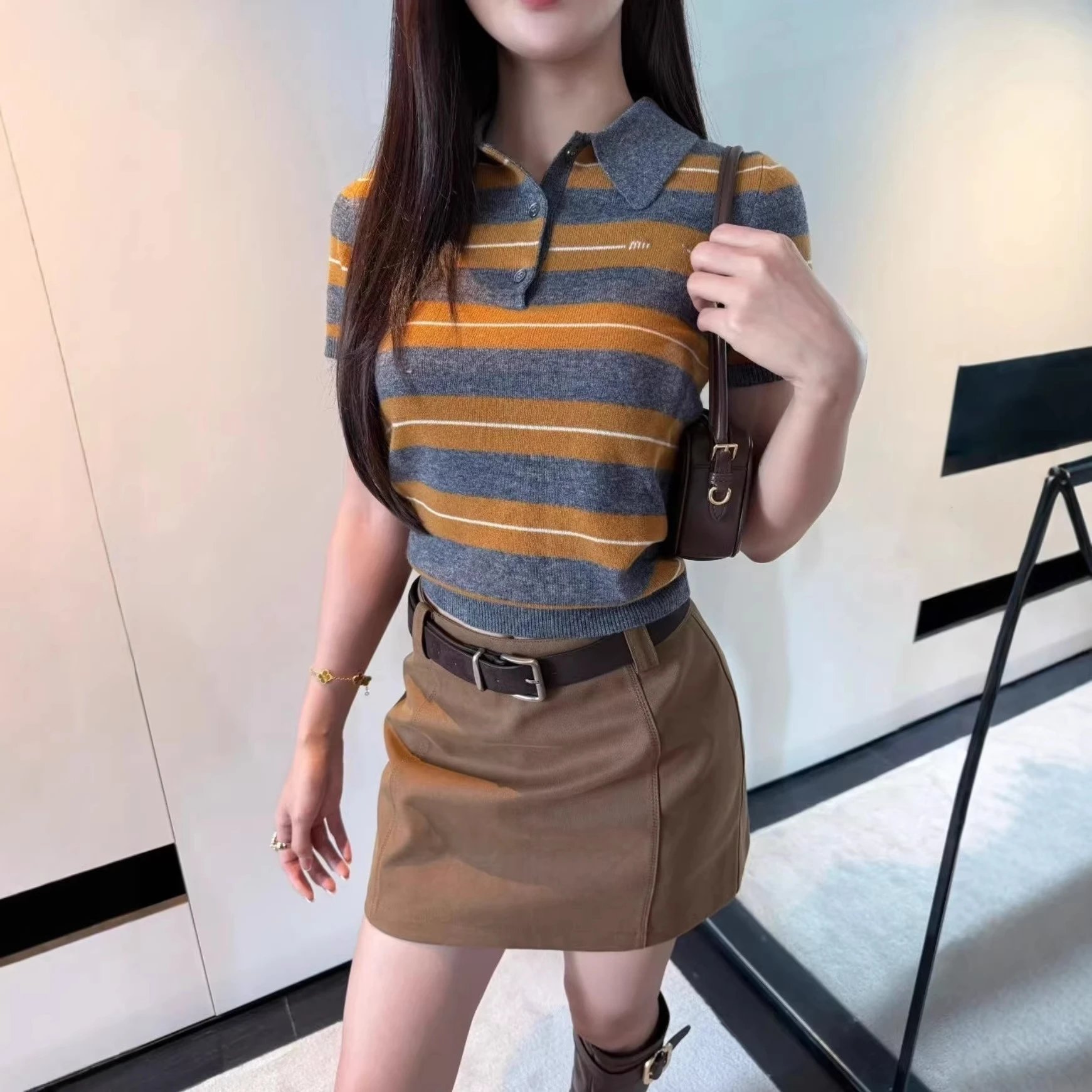 MU家时尚百搭撞色条纹拼色polo领上衣短袖女款高品质修身百搭短袖