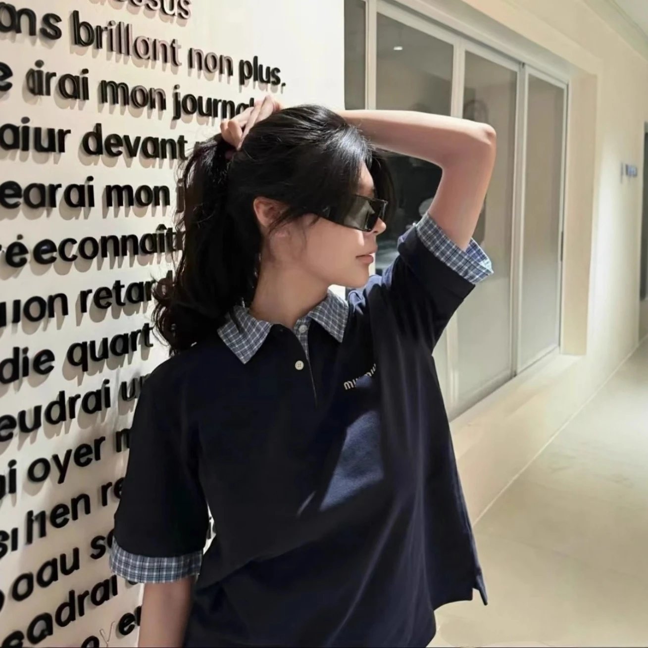 现货miu家拼接衬衫polo领假两件刺绣字母logo正确版本可一件代发
