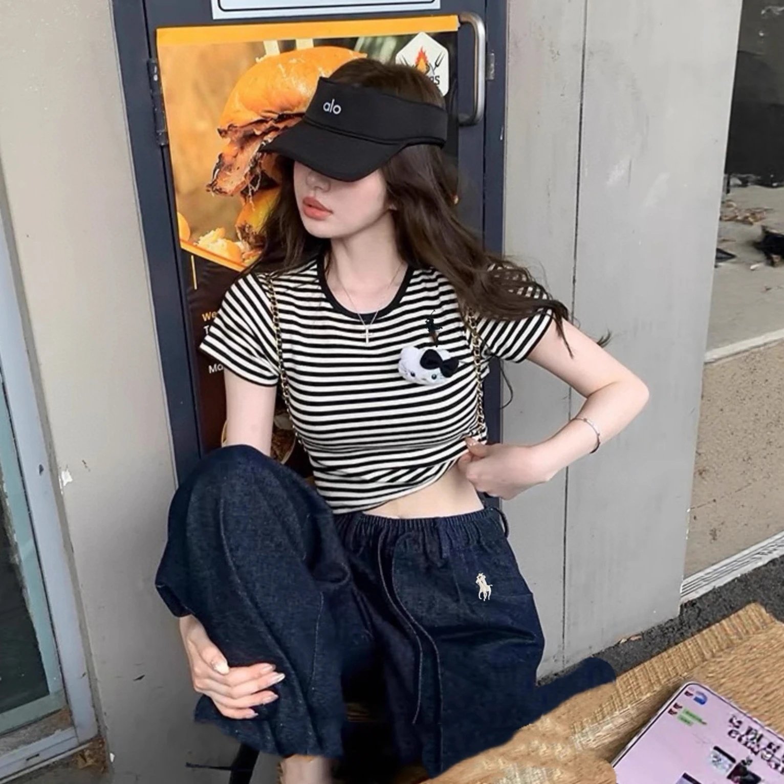 现货RL高品质凯蒂套装送kt猫立体玩偶百搭条纹短袖T恤+长裤套装