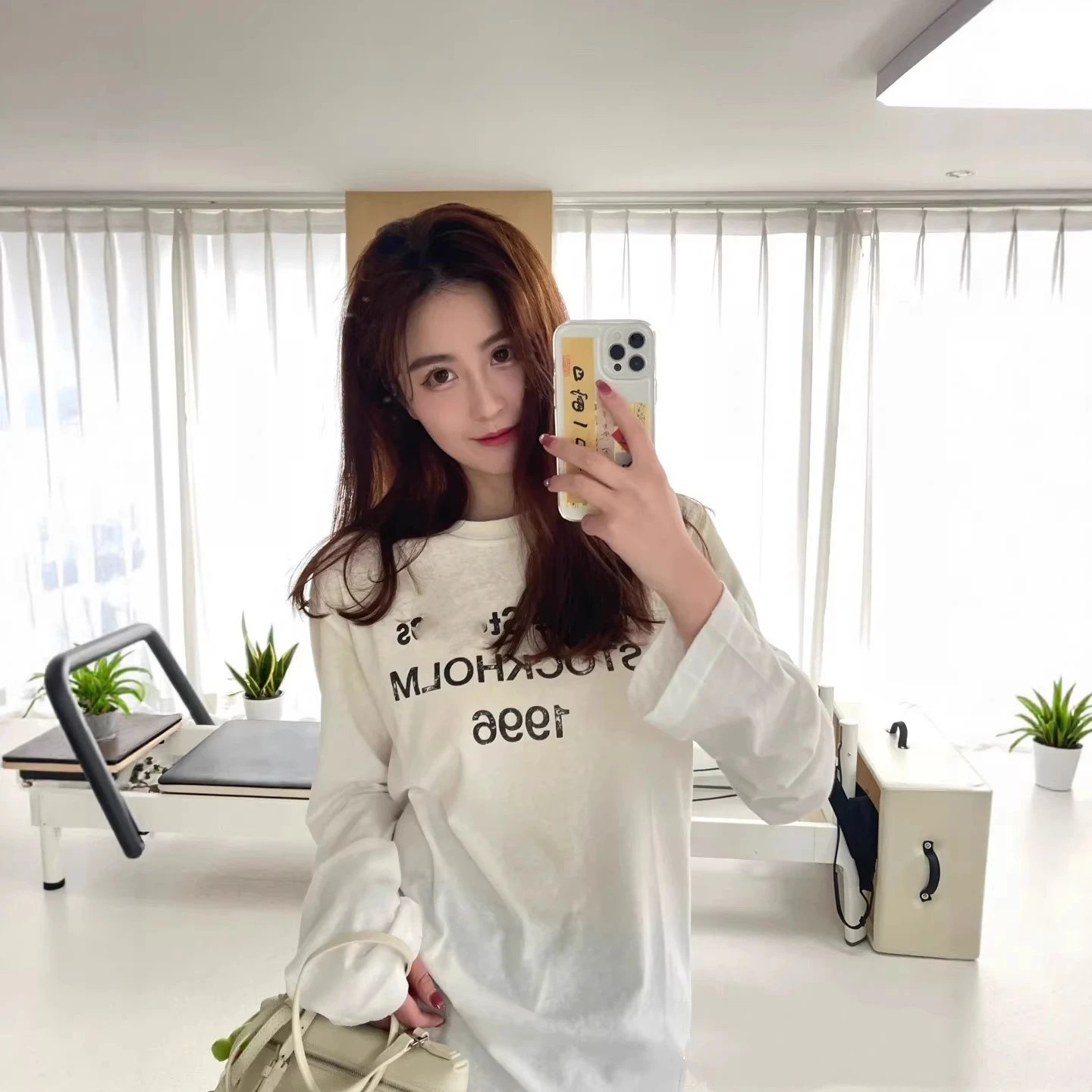现货发~1996纸片人做旧印花廓形长袖T宽松显瘦AC家圆领落肩袖T恤