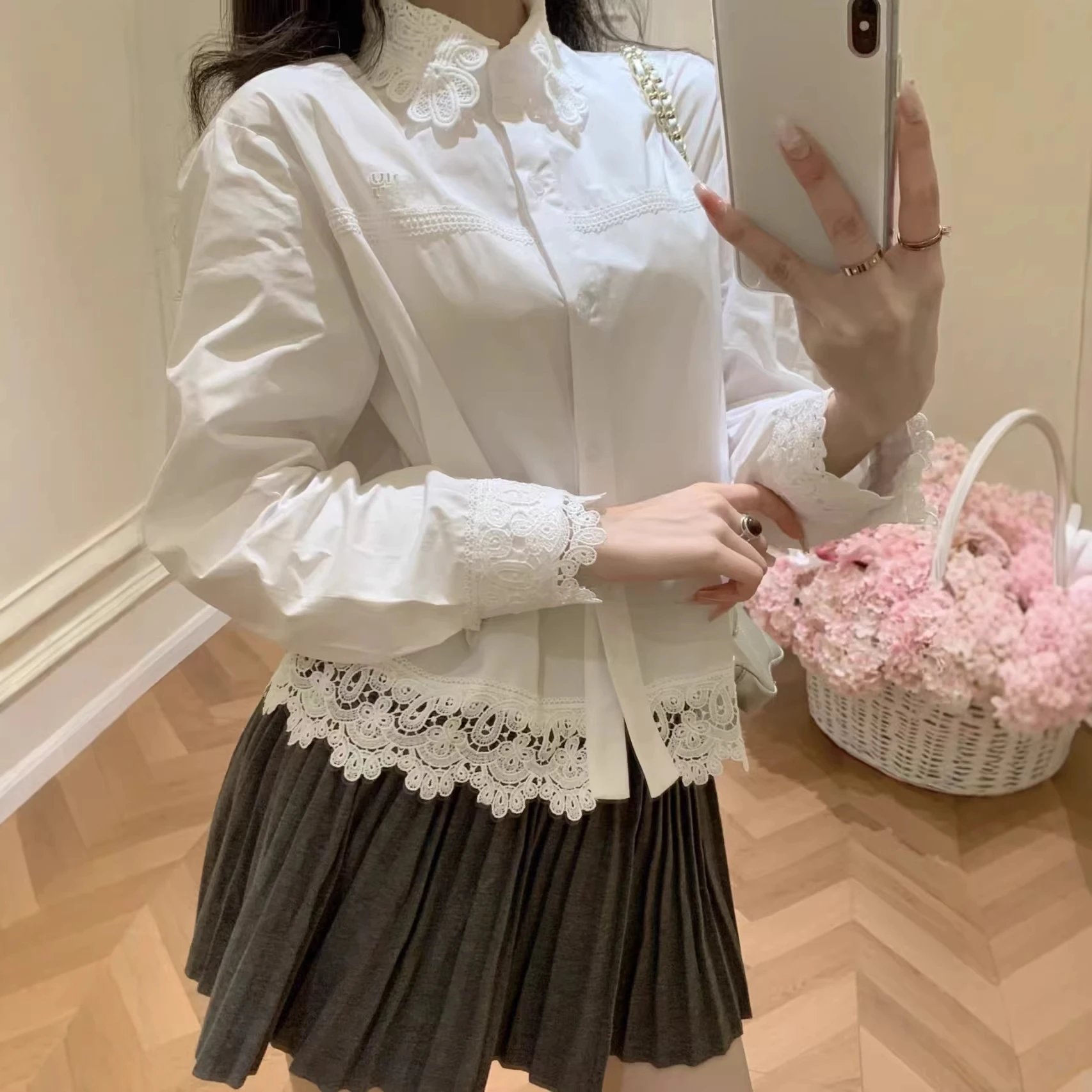 现货mu家重工蕾丝宫廷风拼接翻领上衣早春设计感简约宽松休闲衬衫