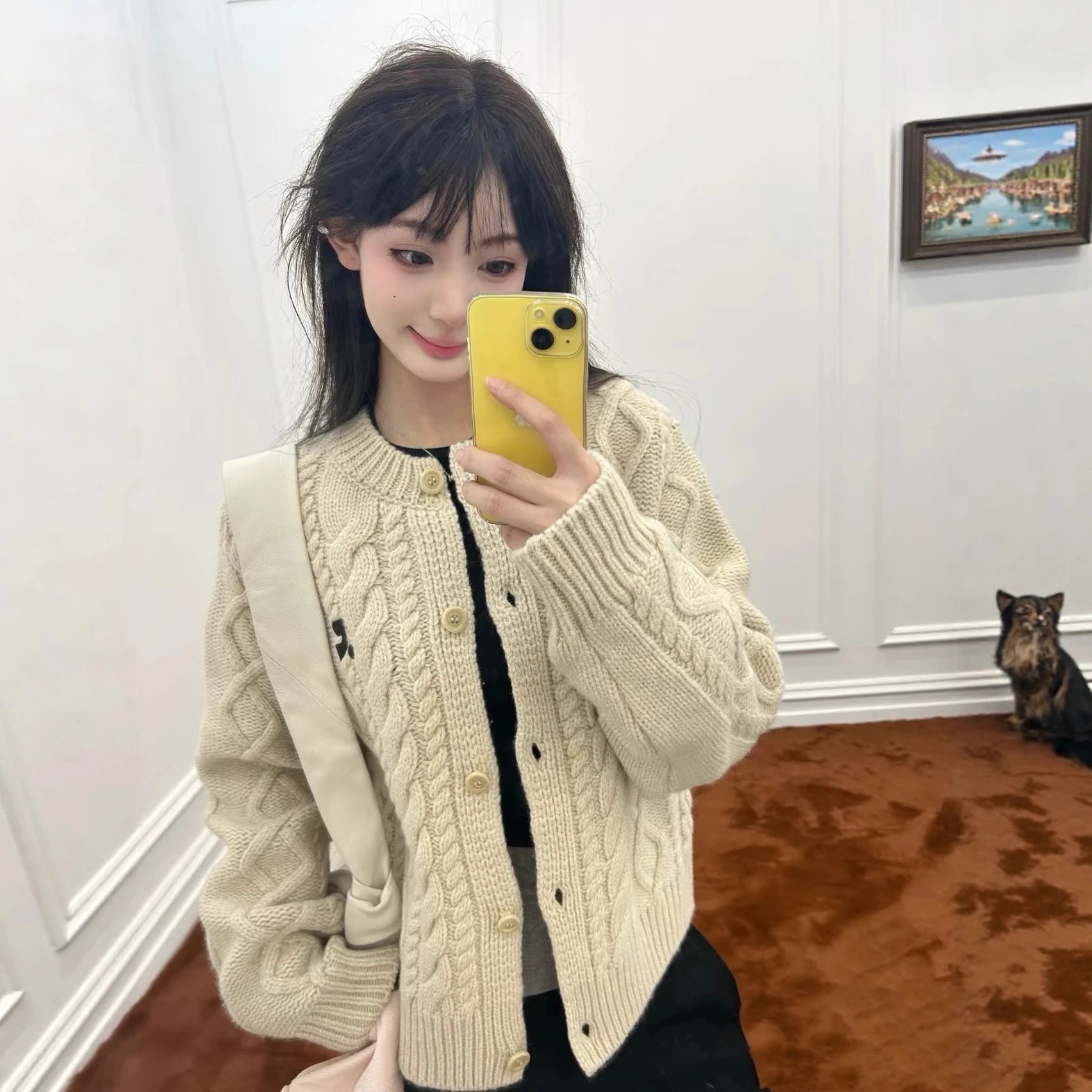 祝绪丹同款RR粗麻花针织开衫韩国小众慵懒感绞花毛衣圆领长袖代发