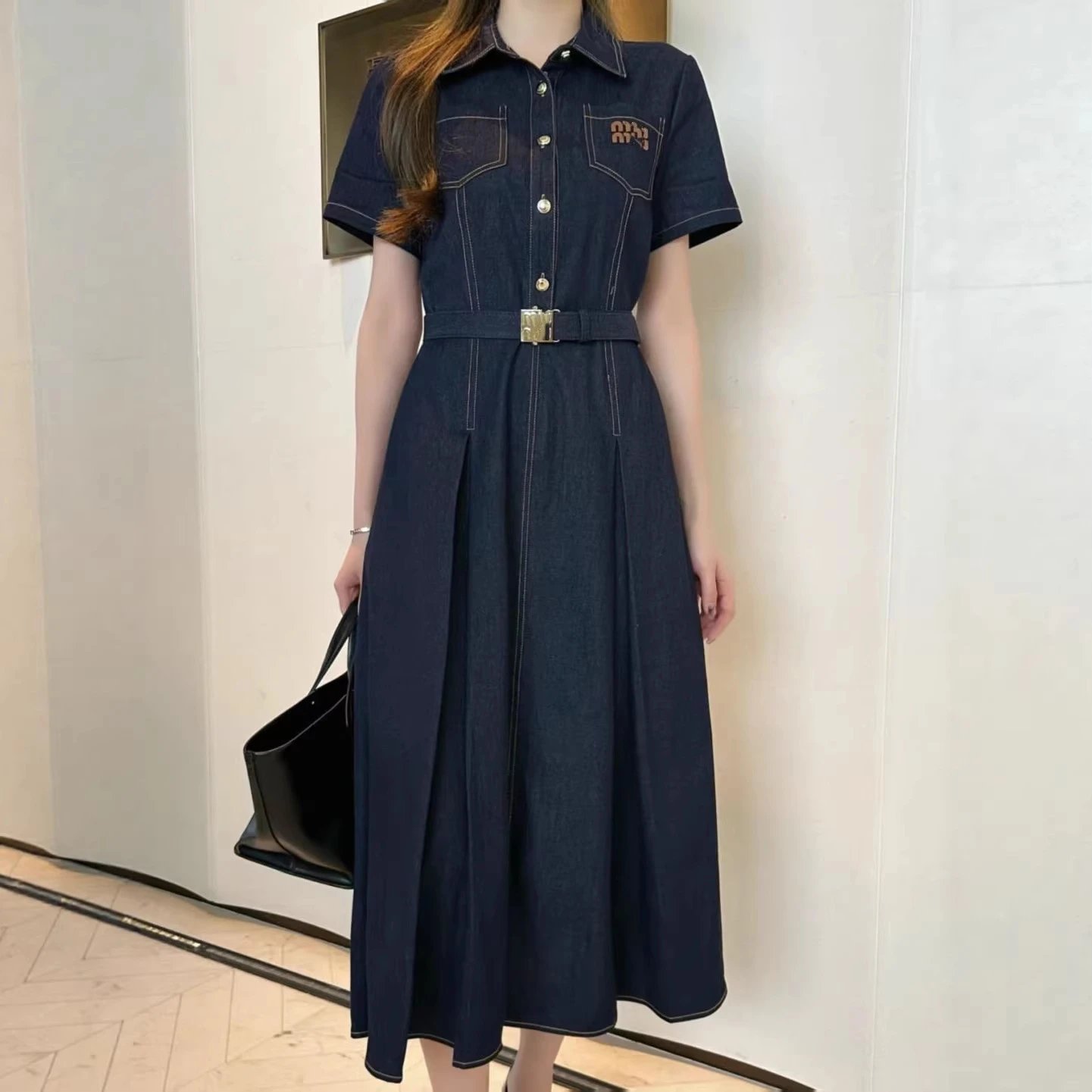 高品质MU家新款棉弹轻薄牛仔中长连衣裙高级感复古连衣裙收腰显瘦