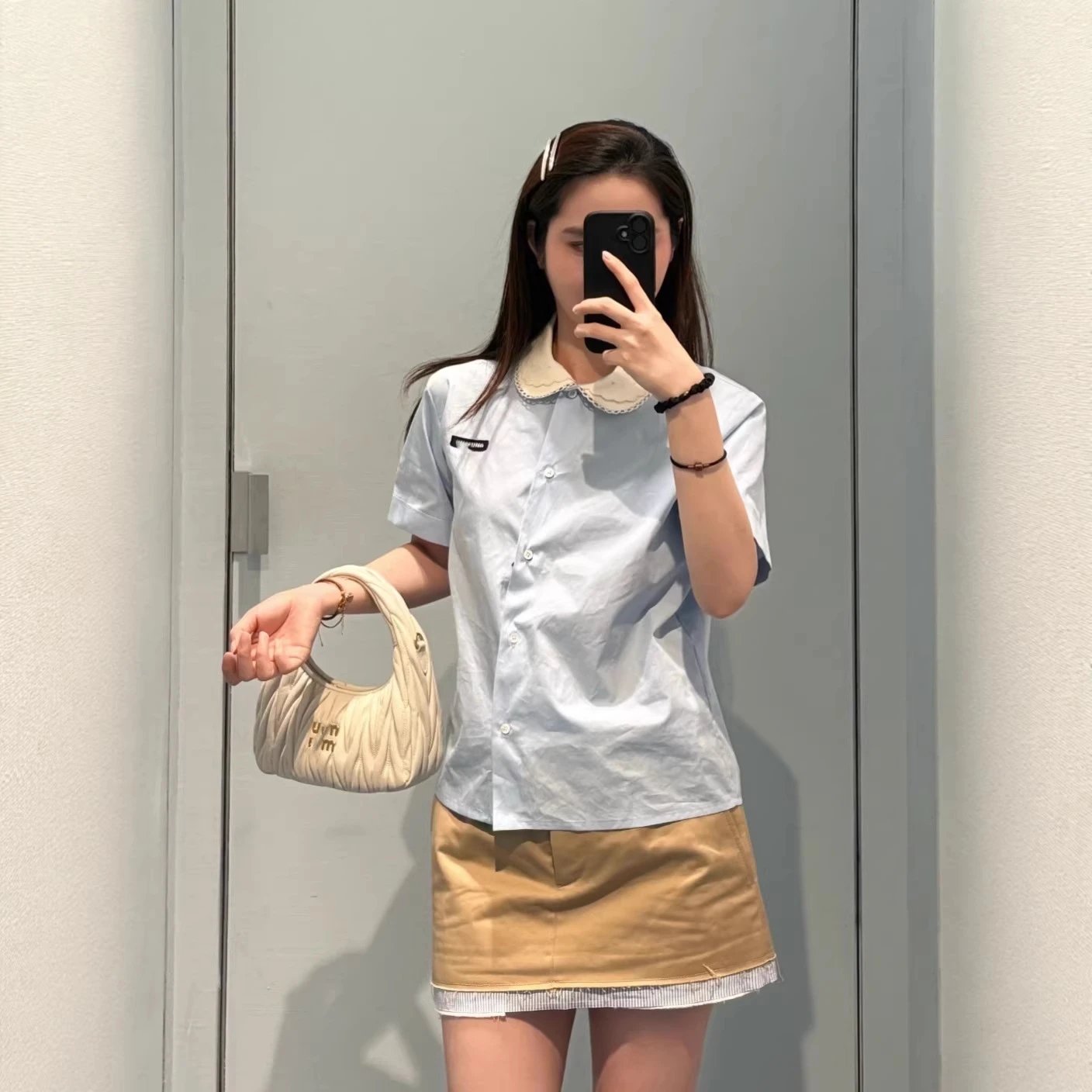 MU家现货26新款清新字母撞色镂空刺绣翻领短袖百搭衬衫可一件代发