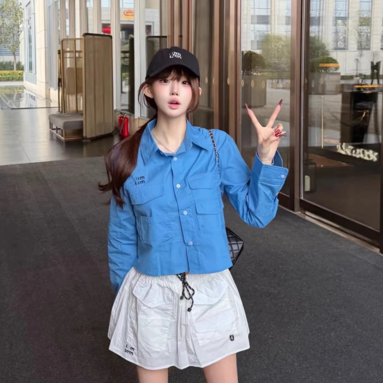 早春新款MU家减龄甜酷少女学院风百搭纽扣口袋翻领衬衫裤裙两件套