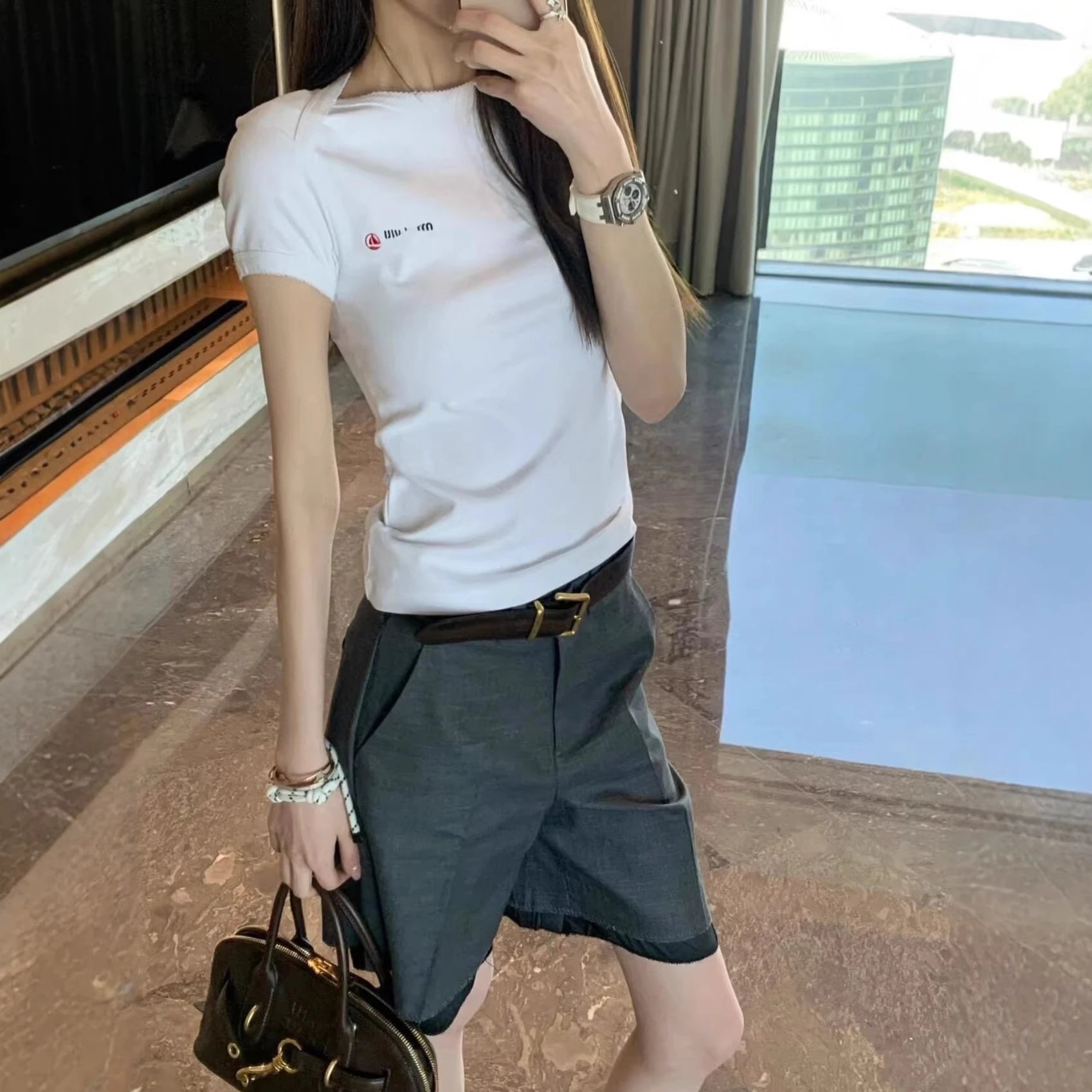 高版本MU缪家网红款小帆船绣花少女感短袖T恤修身百搭显瘦短袖T