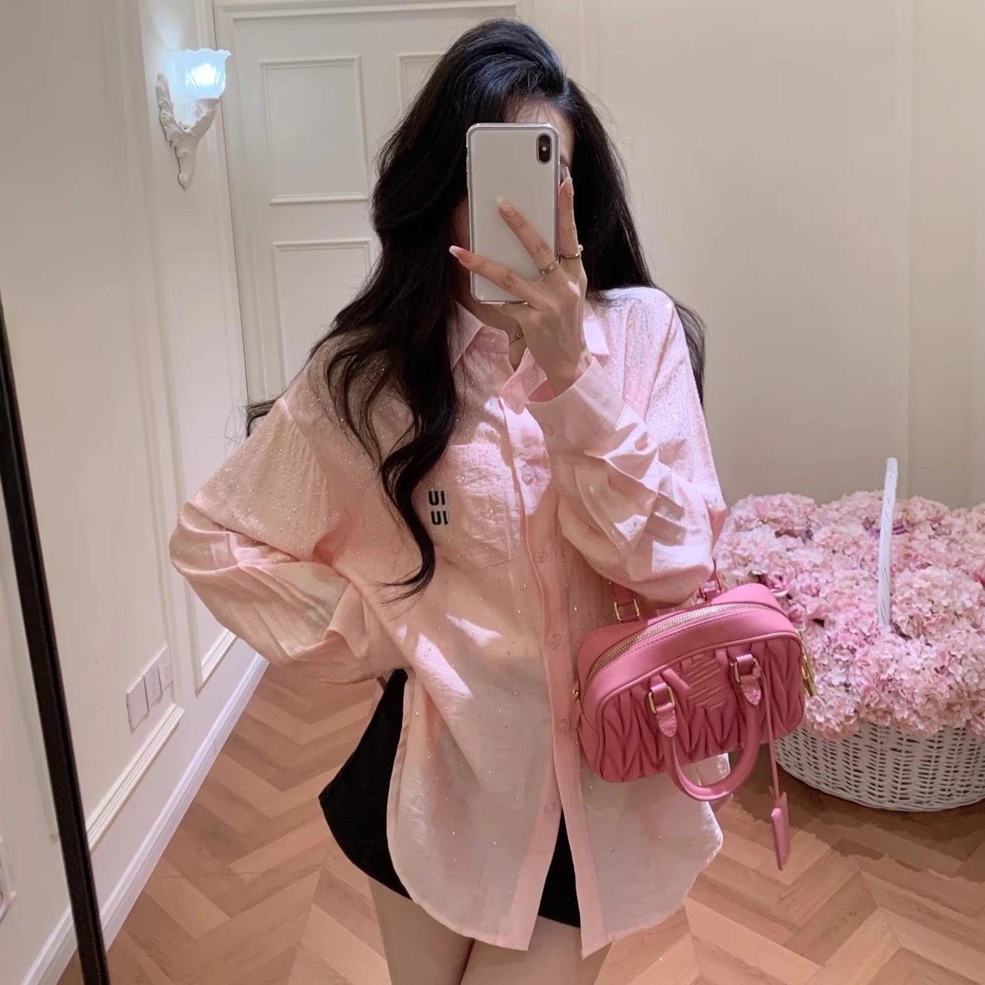 现货MU爆款亮片满钻珍珠单排扣翻领衬衫休闲宽松日常韩系水钻L