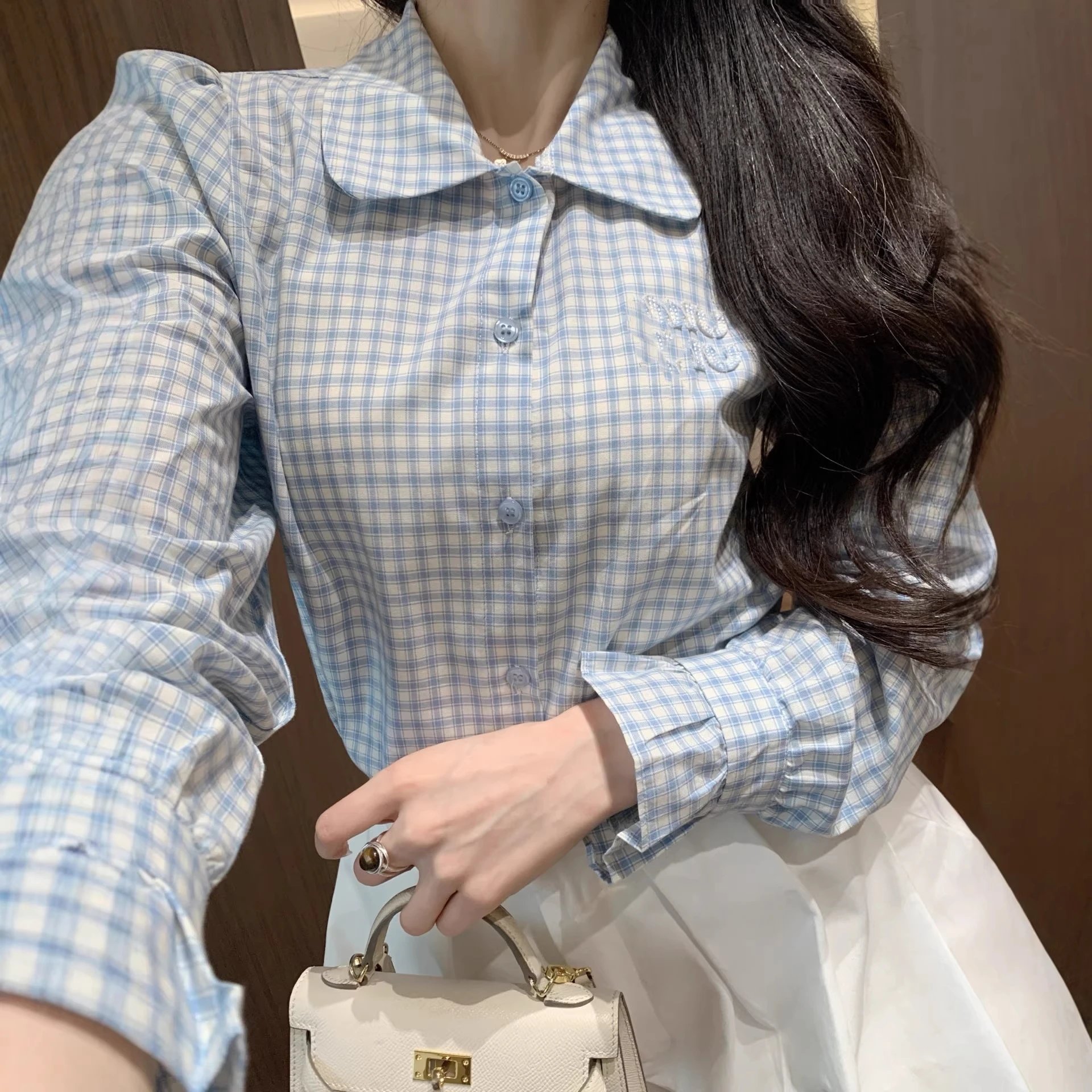 MU家春夏刺绣泡泡袖加荷叶边袖口蓝白格子娃娃领短款衬衫韩系百搭