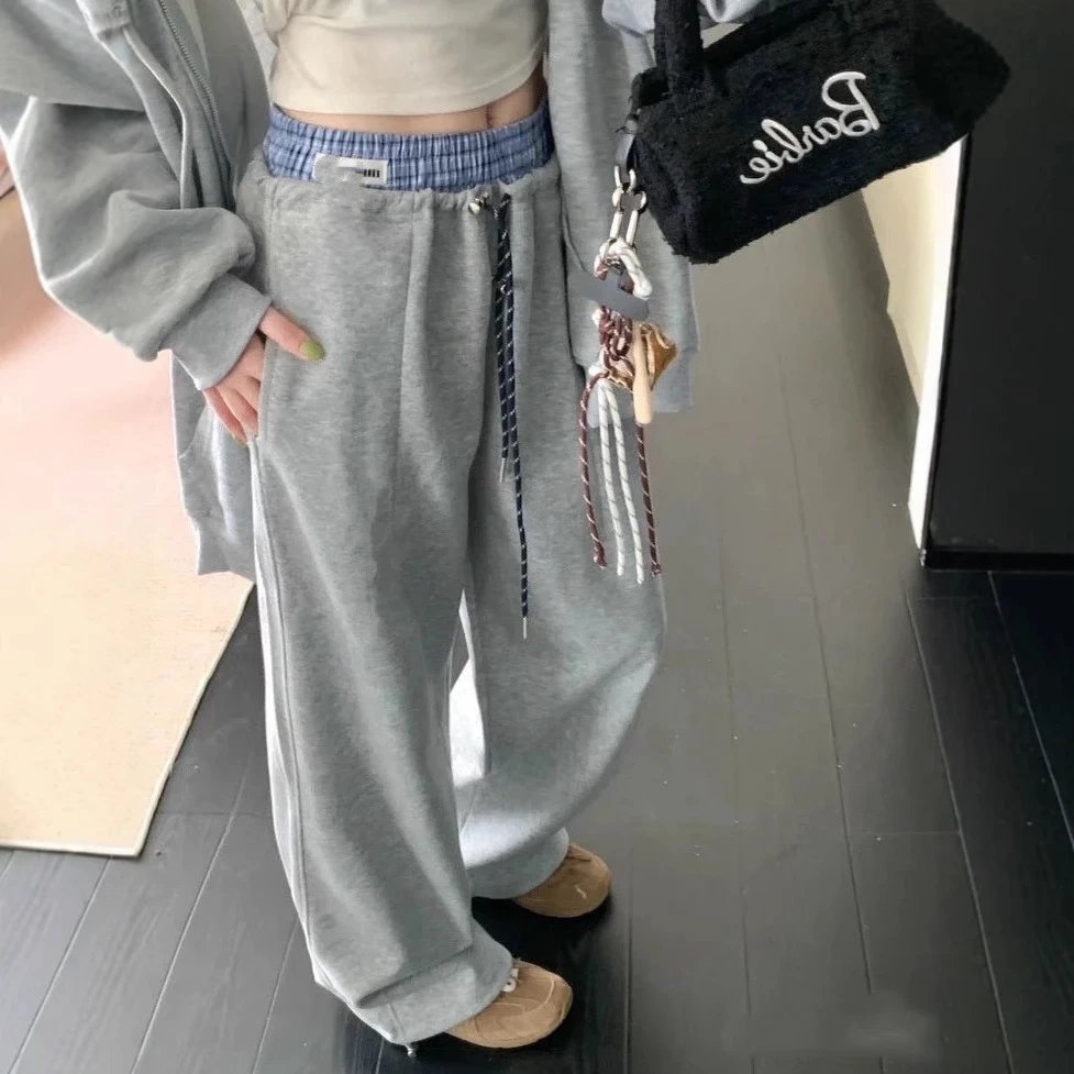 高品质MIU系直筒裤美式百搭格纹双腰假两件宽松休闲直筒裤卫裤女